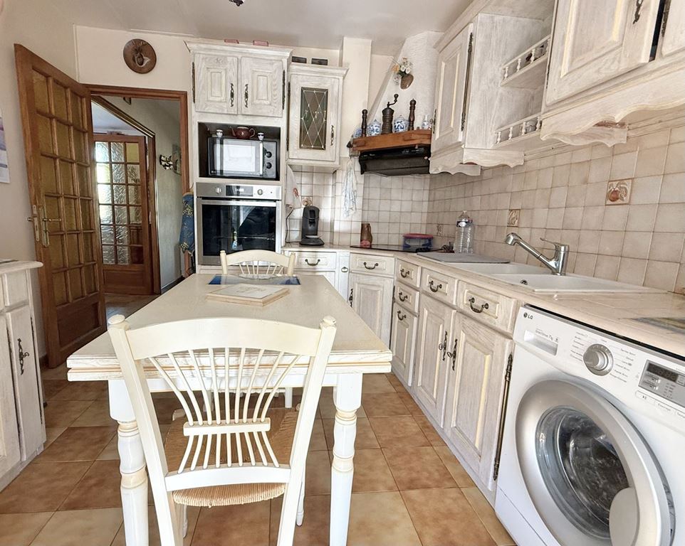 Cette maison comprend également une belle véranda avec barbecue, un garage équipé d’une porte automatique, une dépendance de 14m² et un abri de jardin.